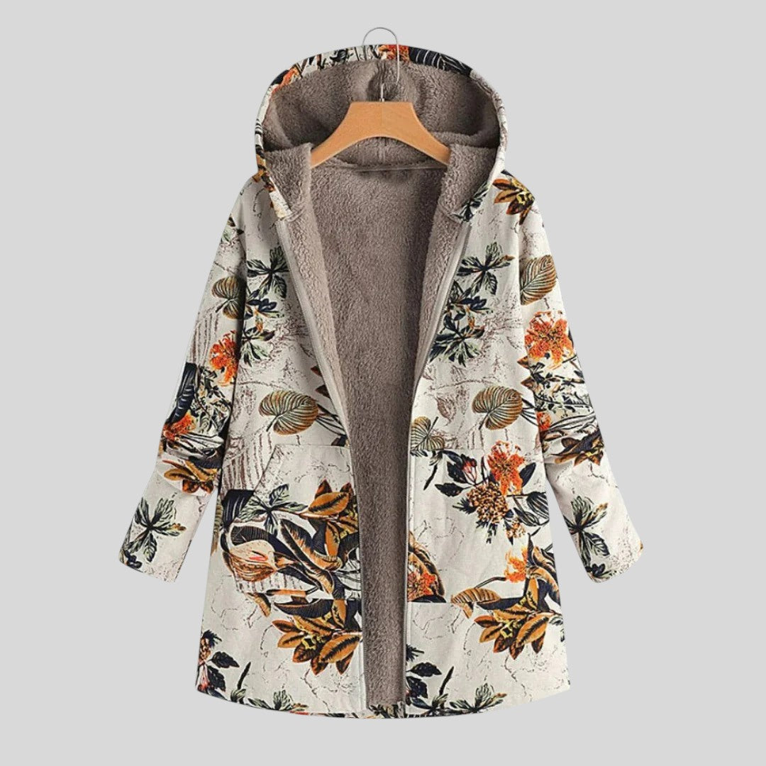 Öltözz fel melegen és időtlen bájjal ebben a kabátban. A kényelmet és a kifinomultságot értékelők számára tervezett kabát gyönyörű virágmintát hoz a mindennapi ruhatáradba. Akár a hűvös őszi levegőn sétálsz, akár egy hűvös estére öltözöl, ez a kabát kényelmes viseletet biztosít, miközben laza stílust kölcsönöz.