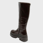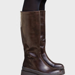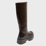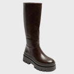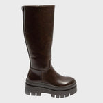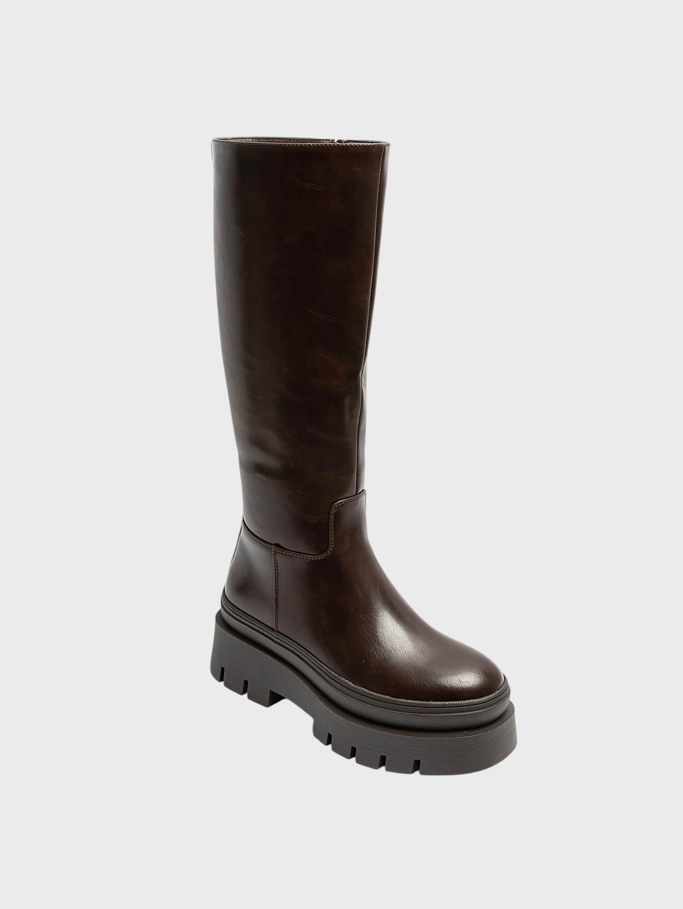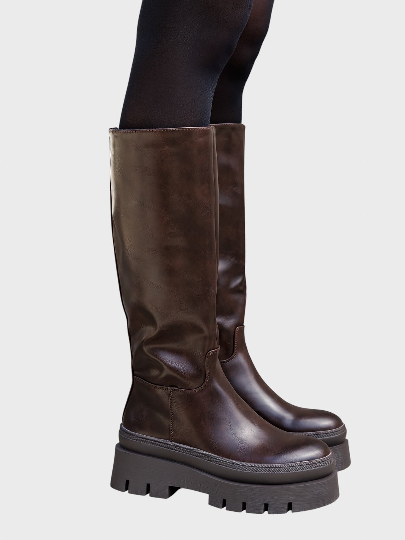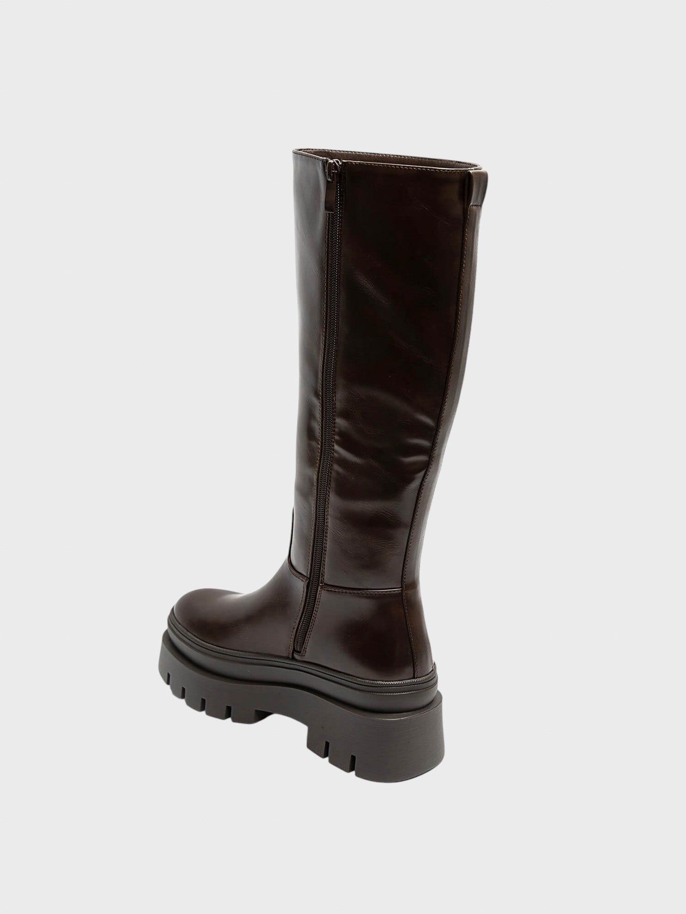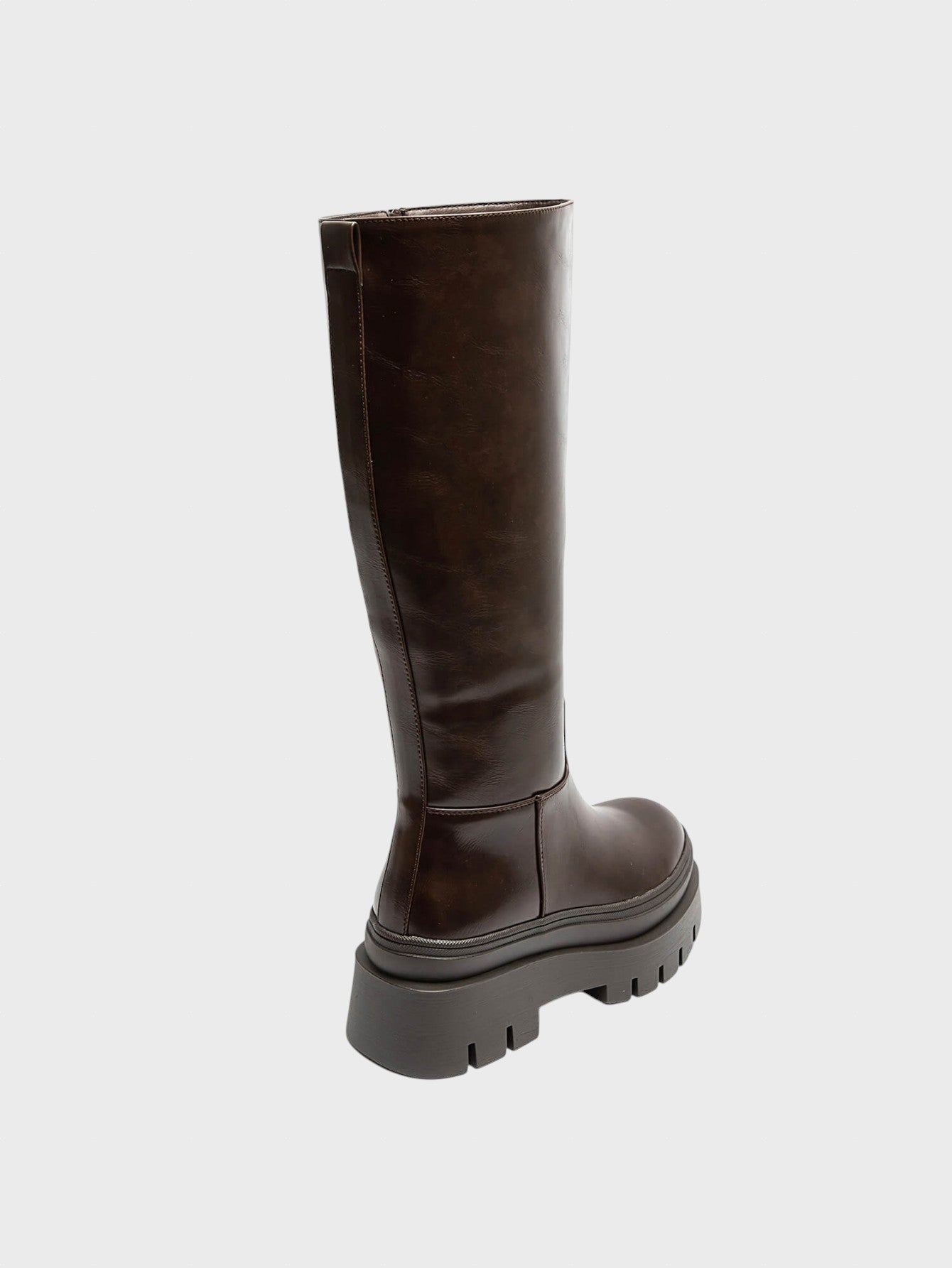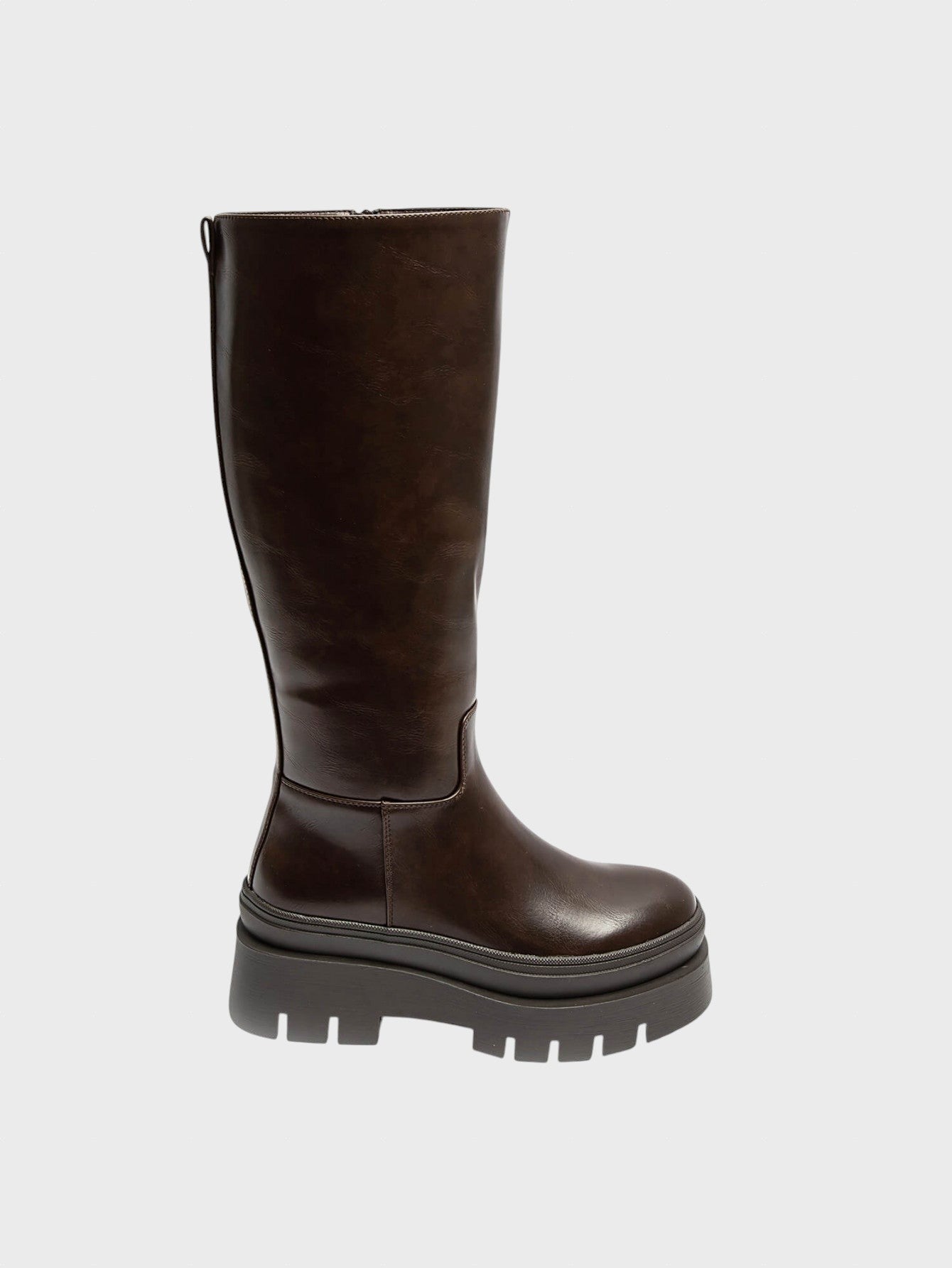 Ezek a barna térdig érő csizmák a stílus és a kényelem tökéletes kombinációját kínálják. A vastag talp modern, robusztus hatást kölcsönöz a megjelenésednek, míg a puha belső rész és a testhez simuló szabás optimális kényelmet biztosít egész nap. Az oldalsó cipzár megkönnyíti a felvételt, az egyszerű kidolgozás pedig időtlen megjelenést kölcsönöz, amely könnyedén kombinálható ruhákkal és farmerekkel.
