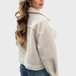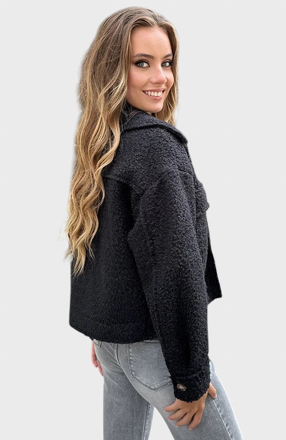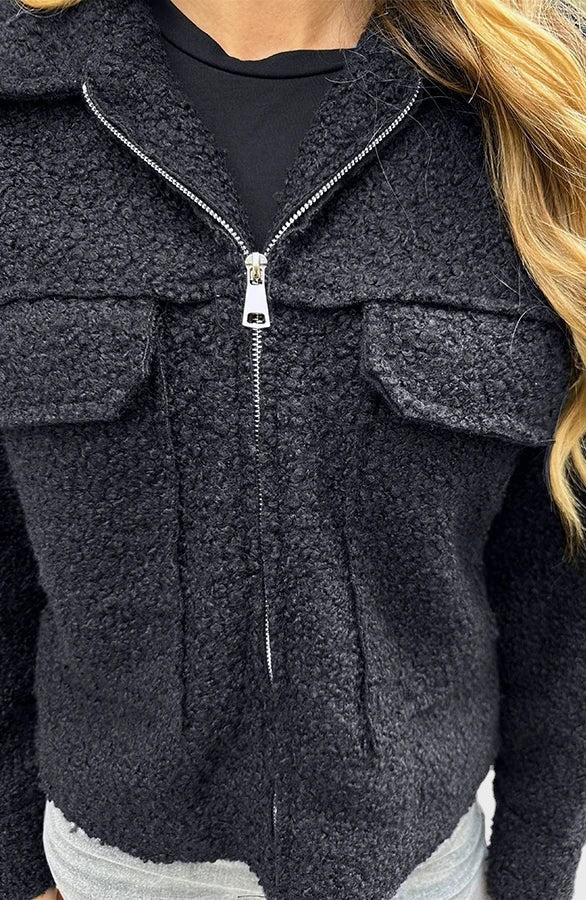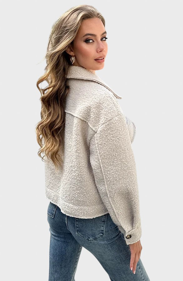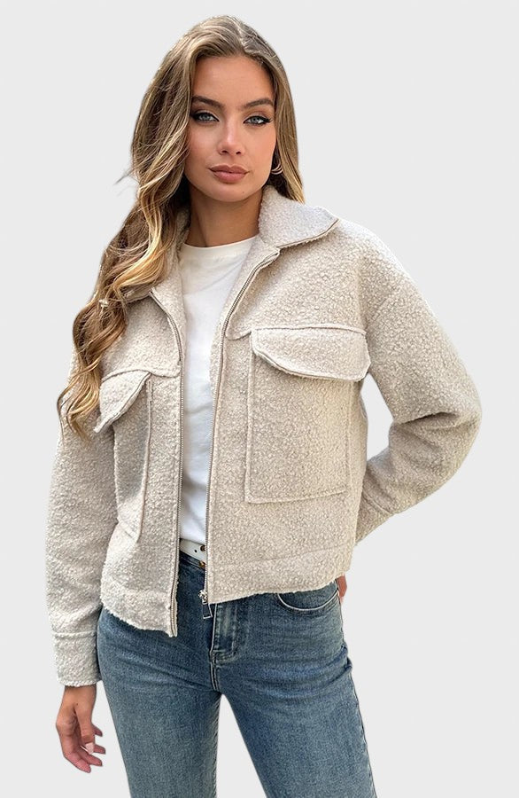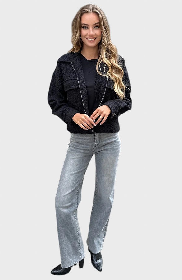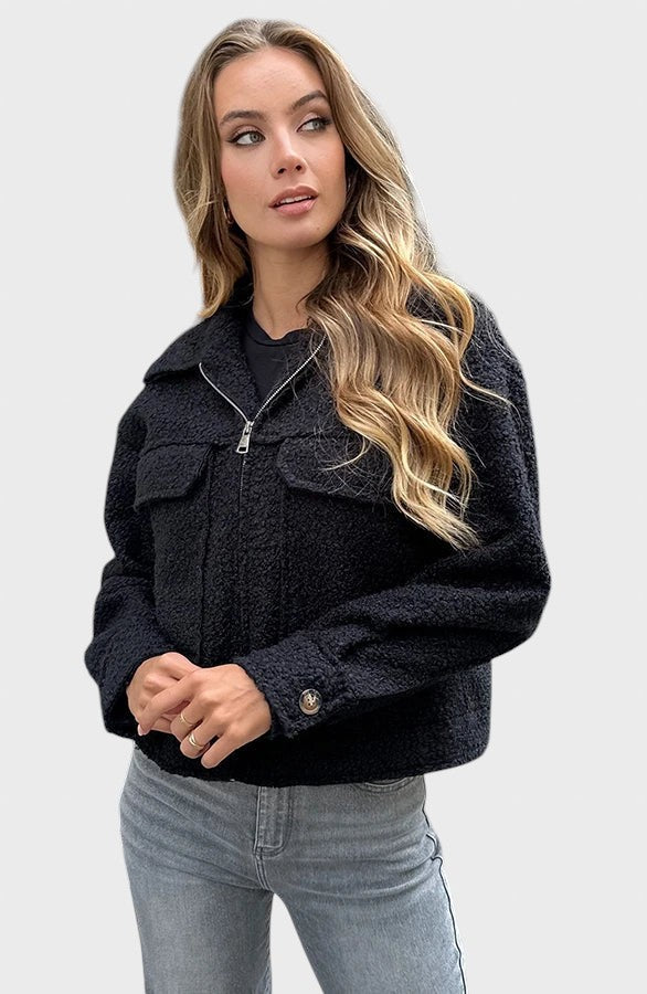 Ez a rövid, bomber stílusú dzseki „Teddy” (bolyhos) textúrájával tűnik ki. Modern darab, amely a bomberdzseki sportos és laza sziluettjét ötvözi a texturált anyagok kényelmével és divatosságával. Tökéletes őszi és enyhébb téli napokra, egy csipetnyi otthonosságot és laza stílust kölcsönöz bármilyen megjelenésnek .