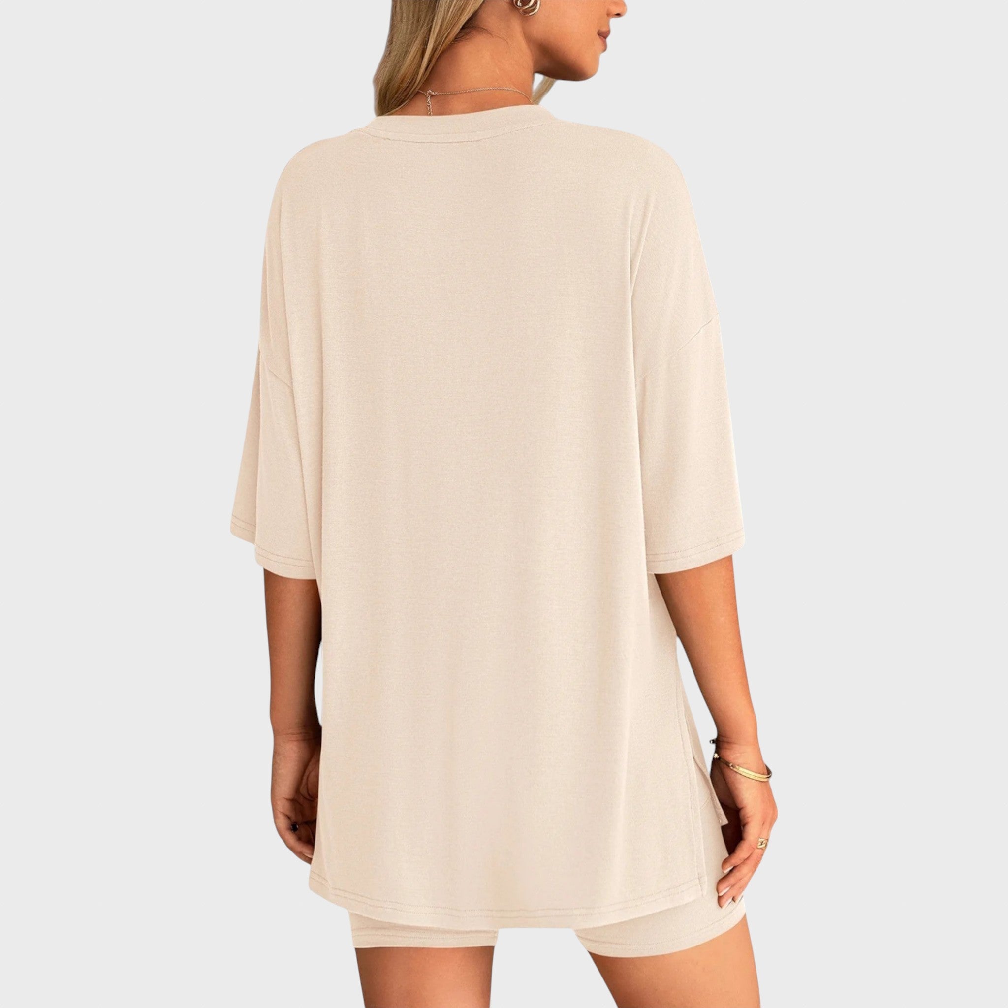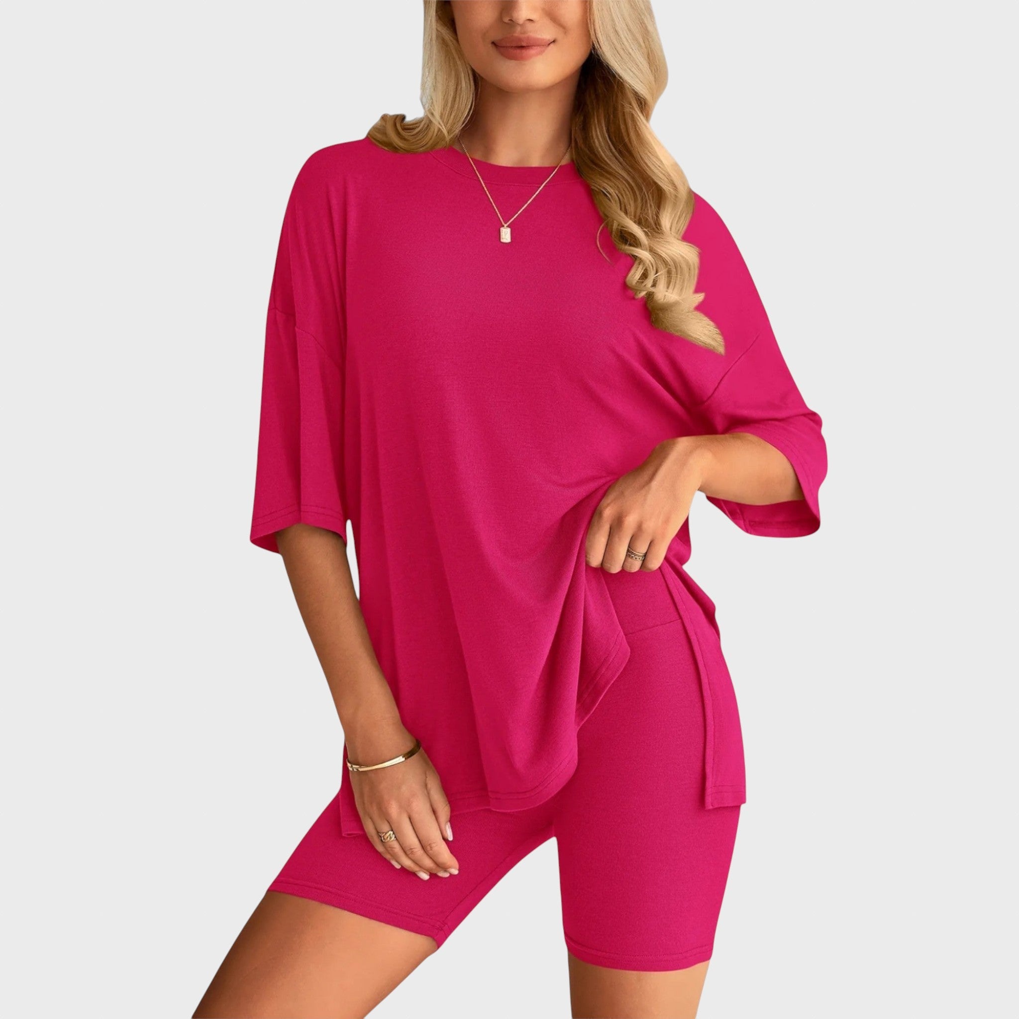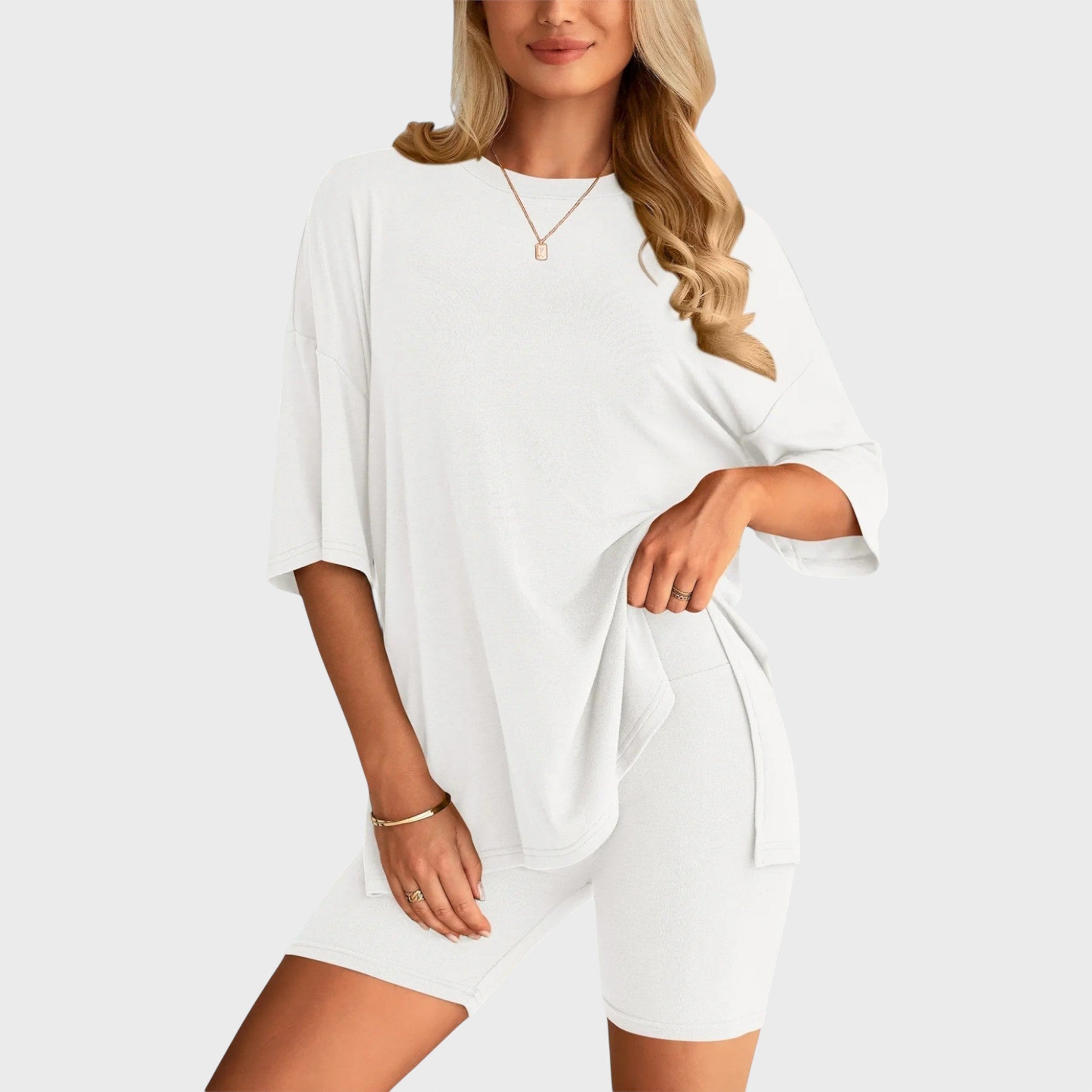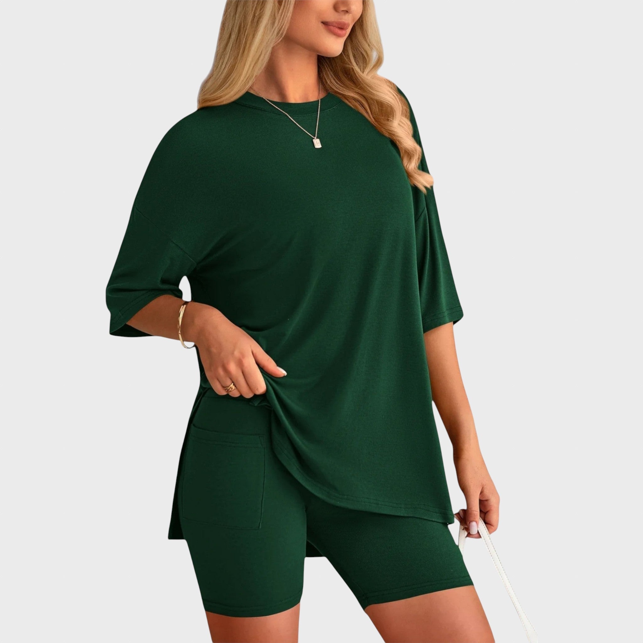• Páratlan kényelem és mozgásszabadság: a szett egy laza szabású pólót és magas derekú rövidnadrágot kombinál, így biztosítva a kényelmes viseletet és a korlátlan mozgásszabadságot bármilyen tevékenység során.