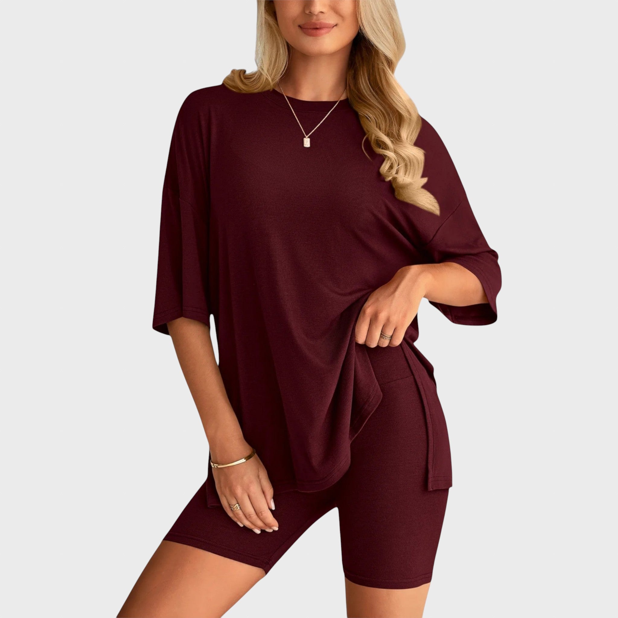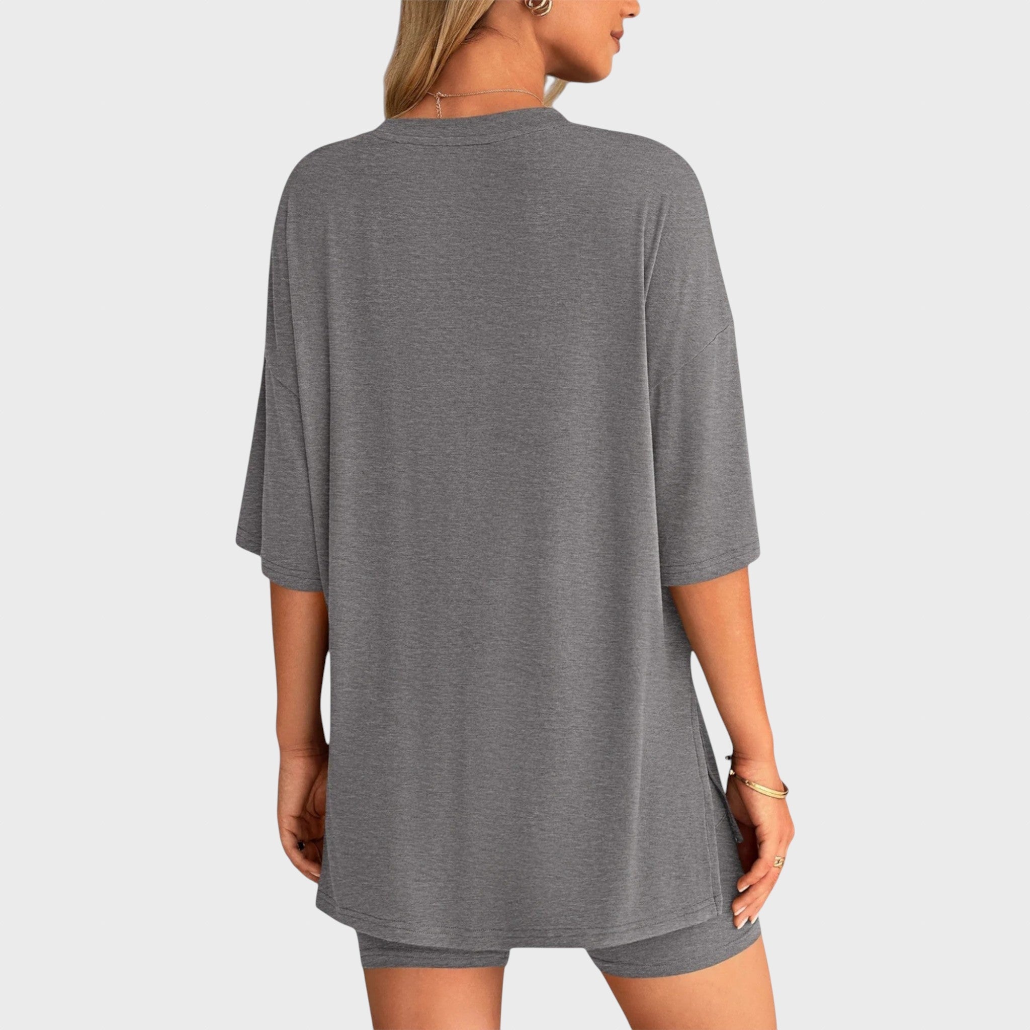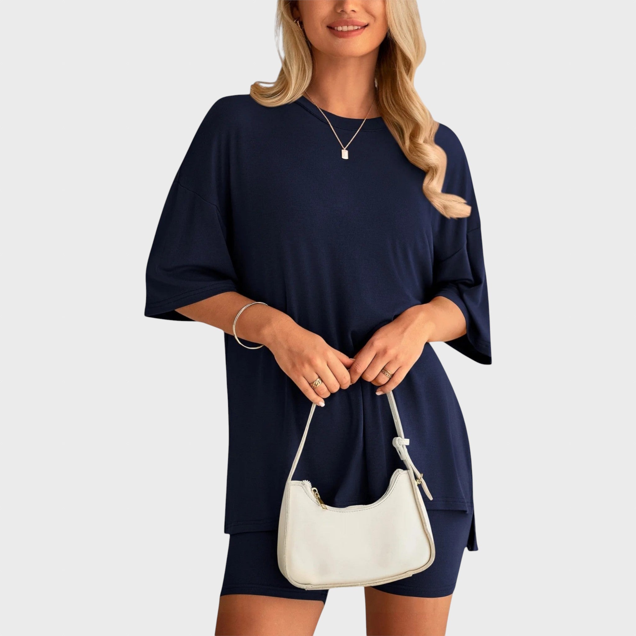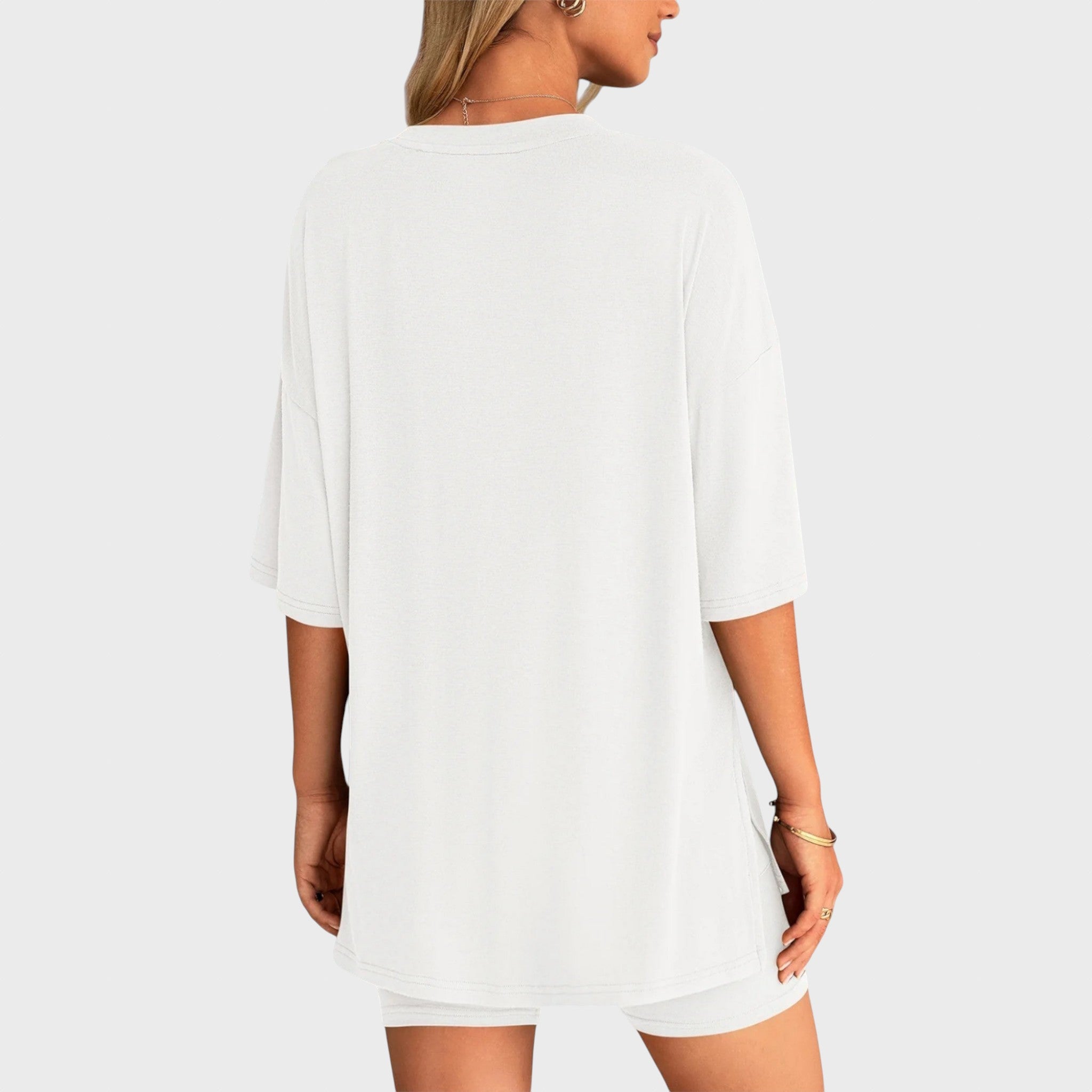 • Páratlan kényelem és mozgásszabadság: a szett egy laza szabású pólót és magas derekú rövidnadrágot kombinál, így biztosítva a kényelmes viseletet és a korlátlan mozgásszabadságot bármilyen tevékenység során.