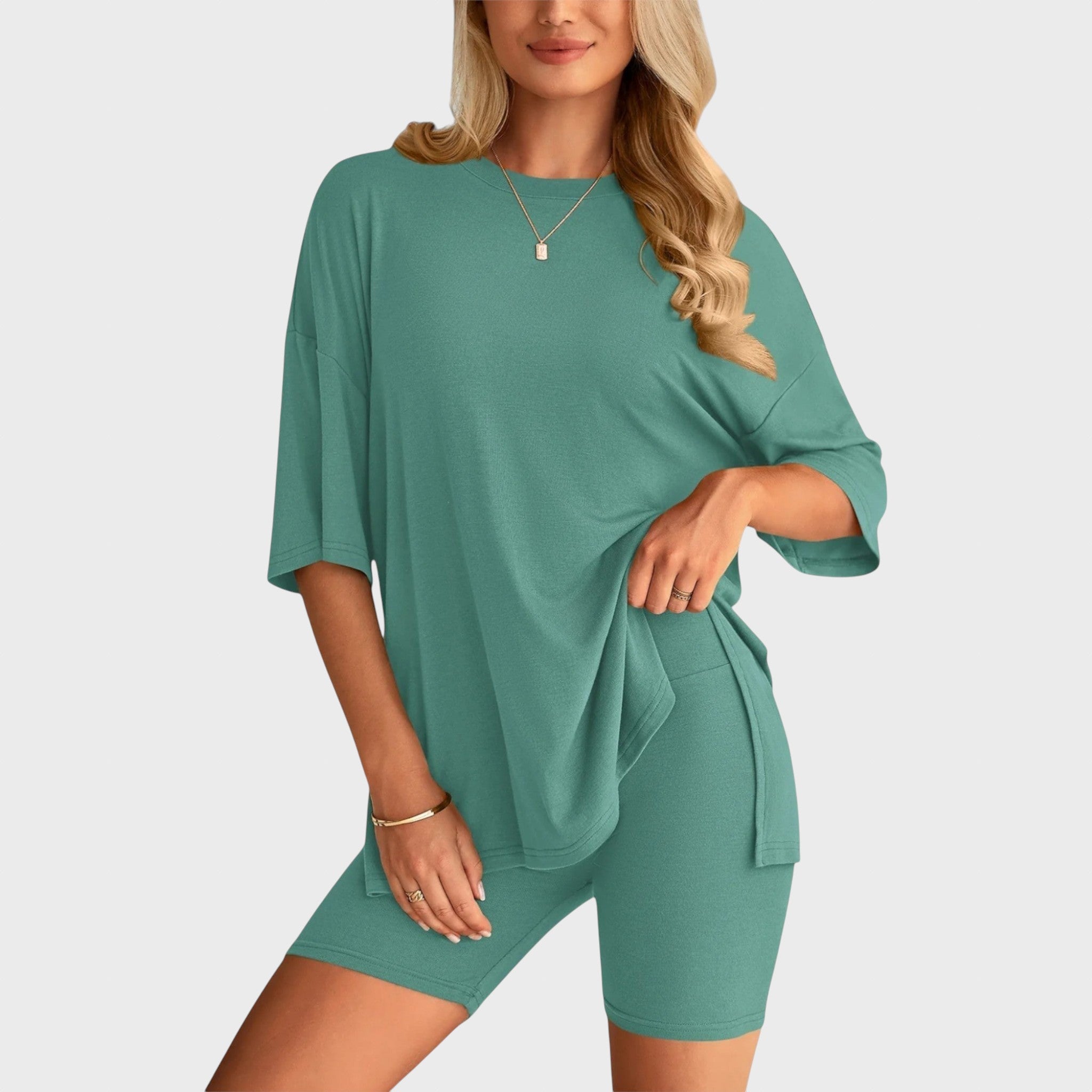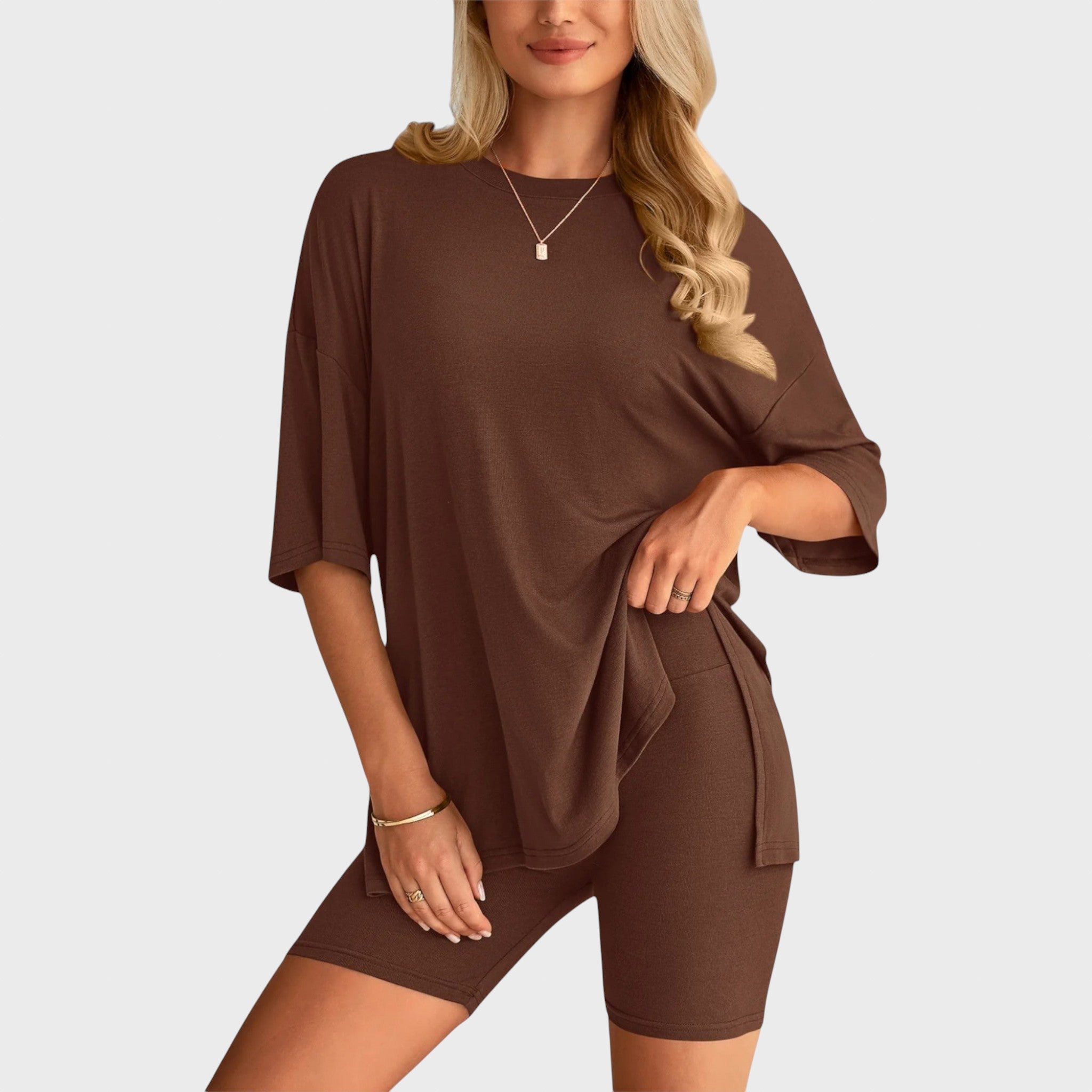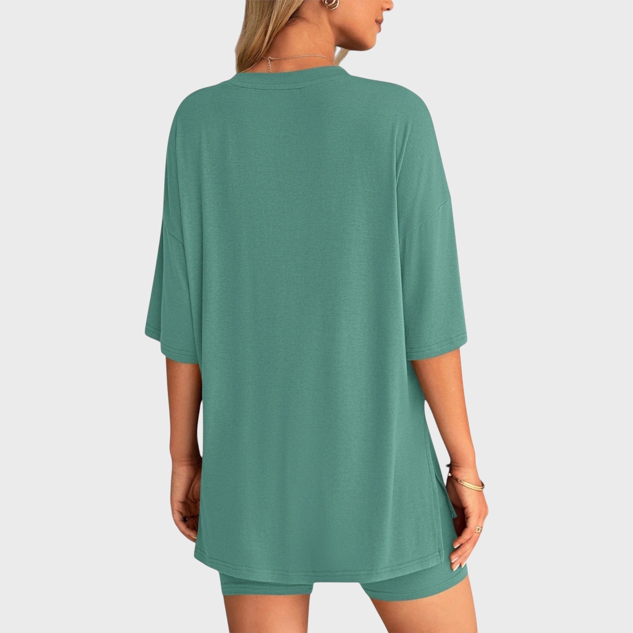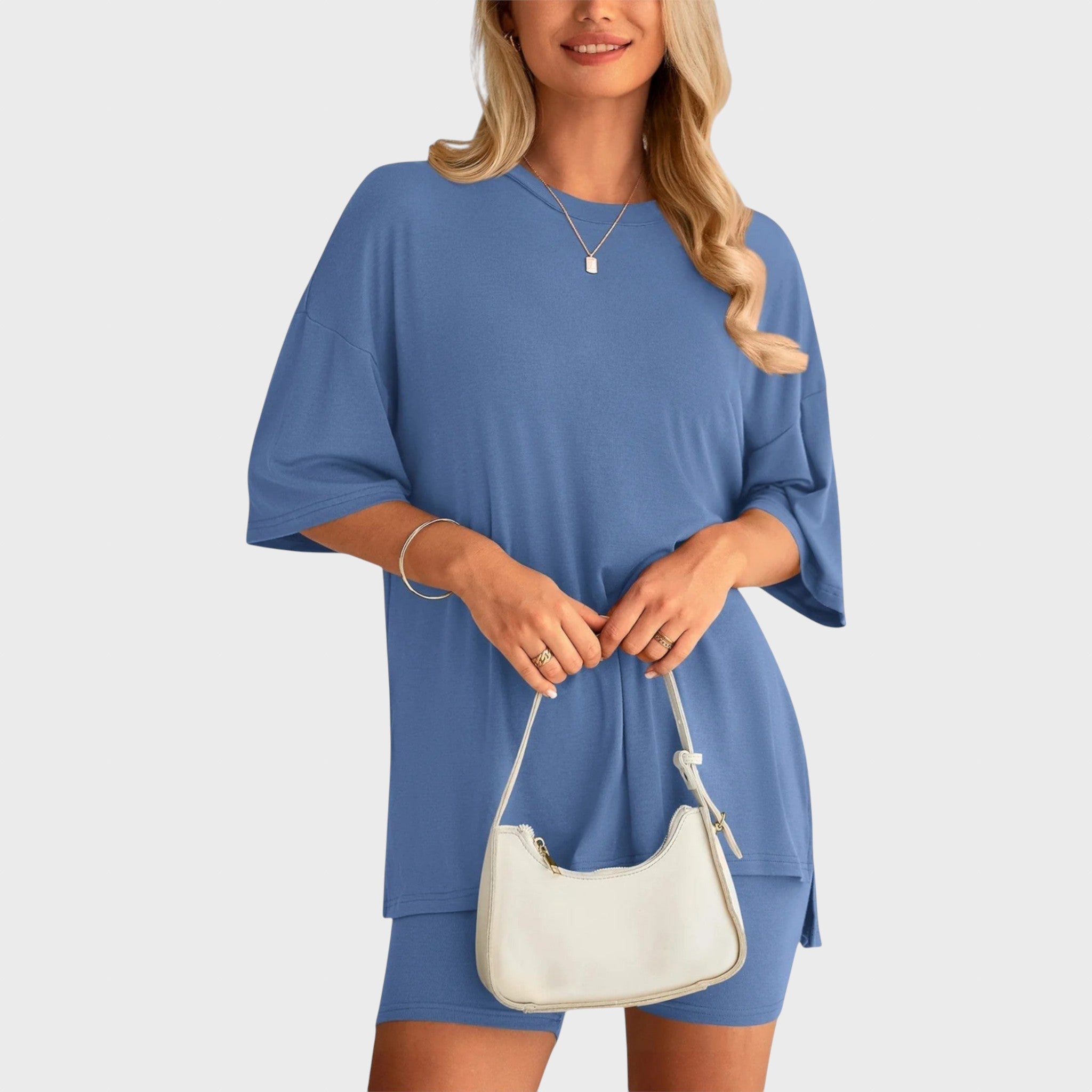 • Páratlan kényelem és mozgásszabadság: a szett egy laza szabású pólót és magas derekú rövidnadrágot kombinál, így biztosítva a kényelmes viseletet és a korlátlan mozgásszabadságot bármilyen tevékenység során.