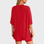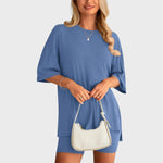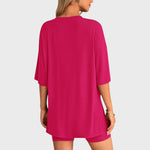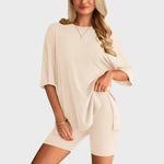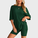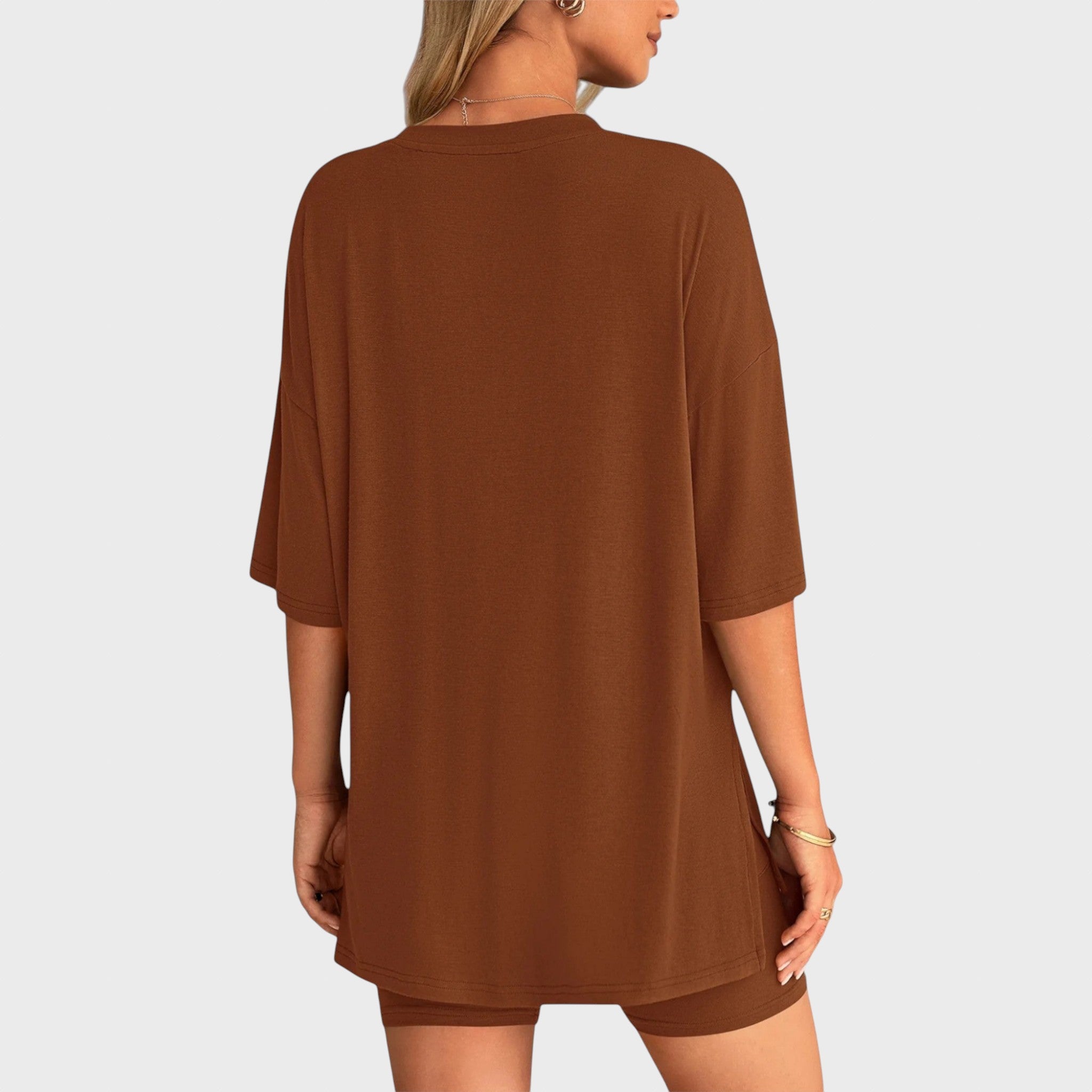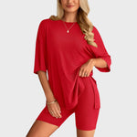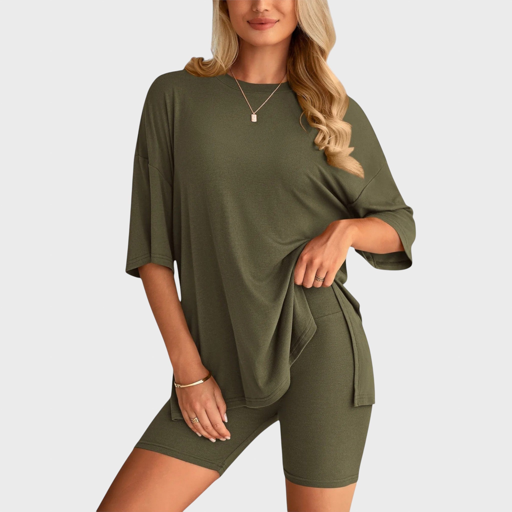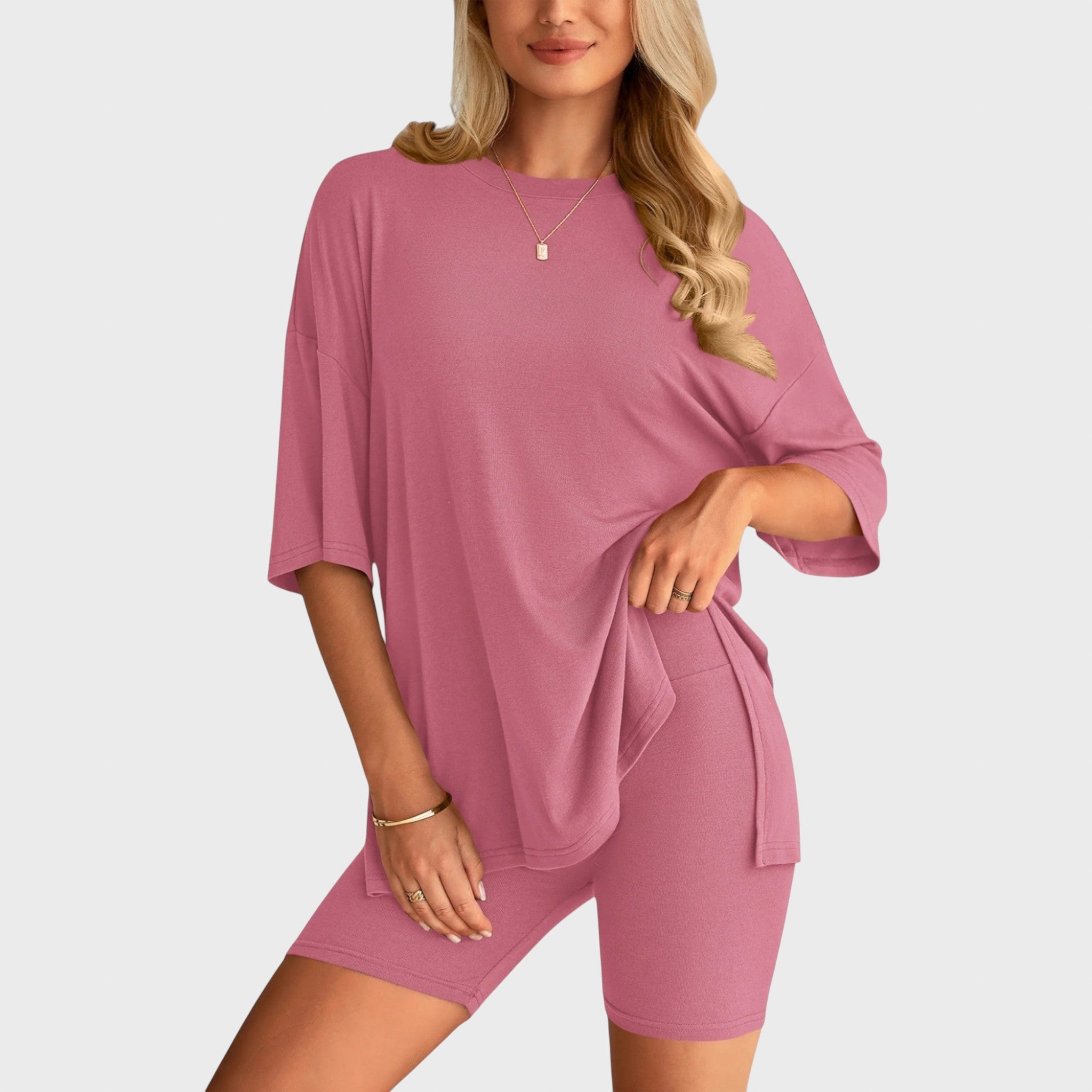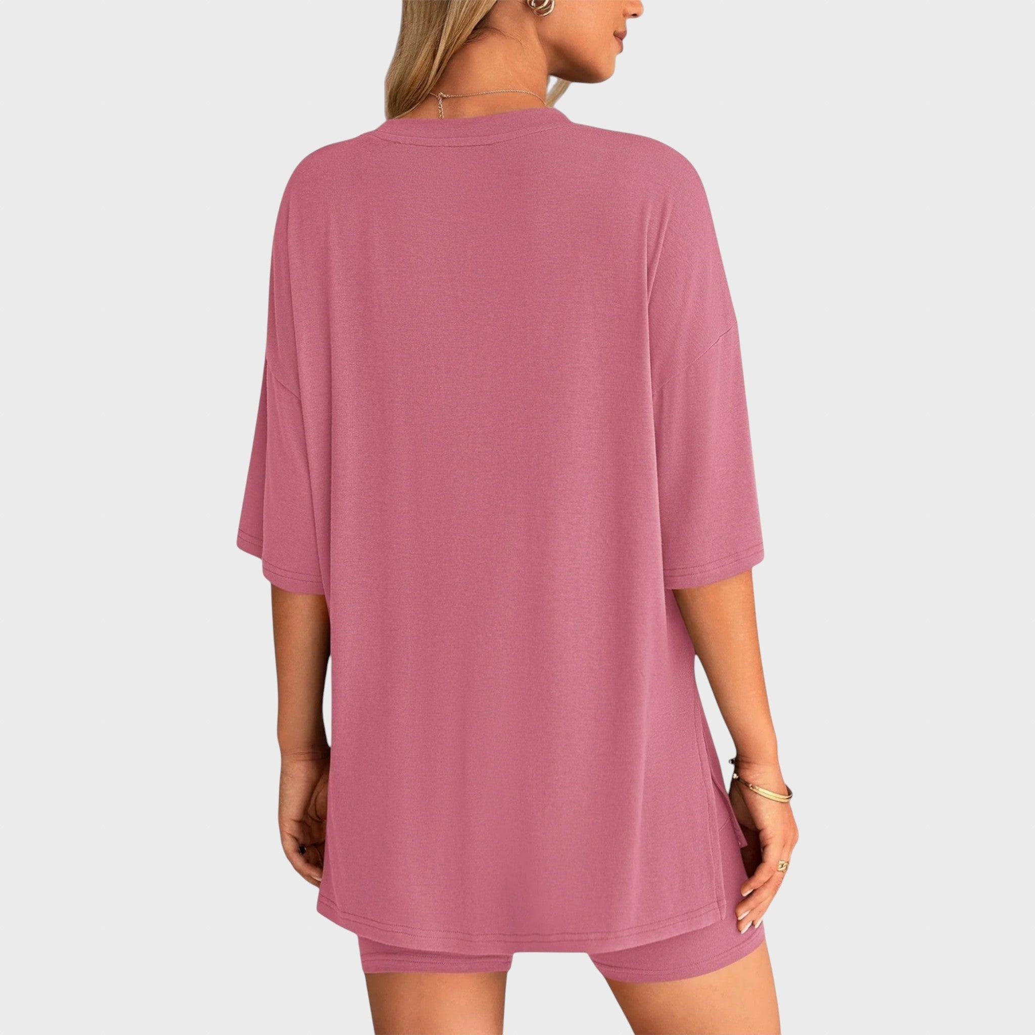 • Páratlan kényelem és mozgásszabadság: a szett egy laza szabású pólót és magas derekú rövidnadrágot kombinál, így biztosítva a kényelmes viseletet és a korlátlan mozgásszabadságot bármilyen tevékenység során.