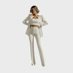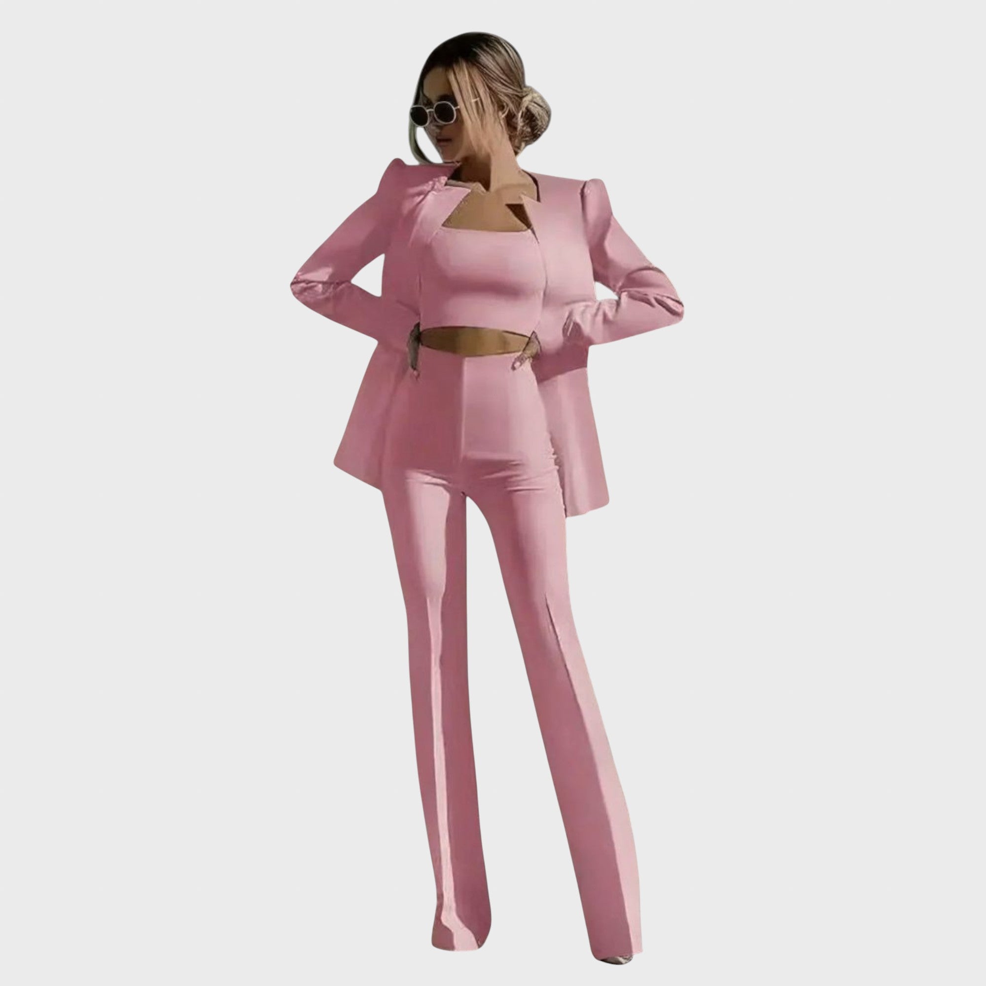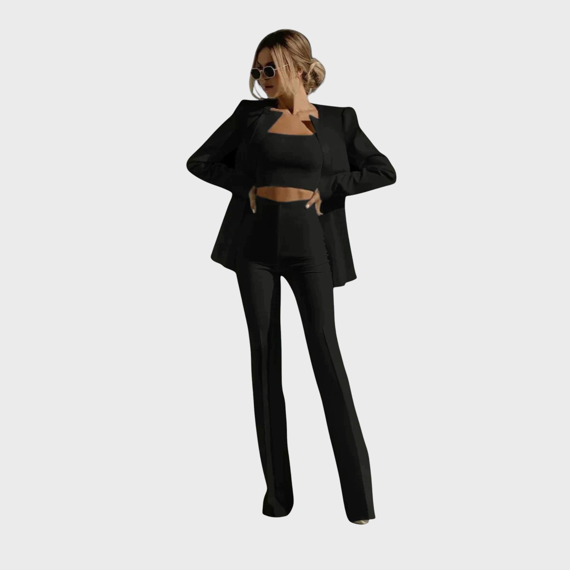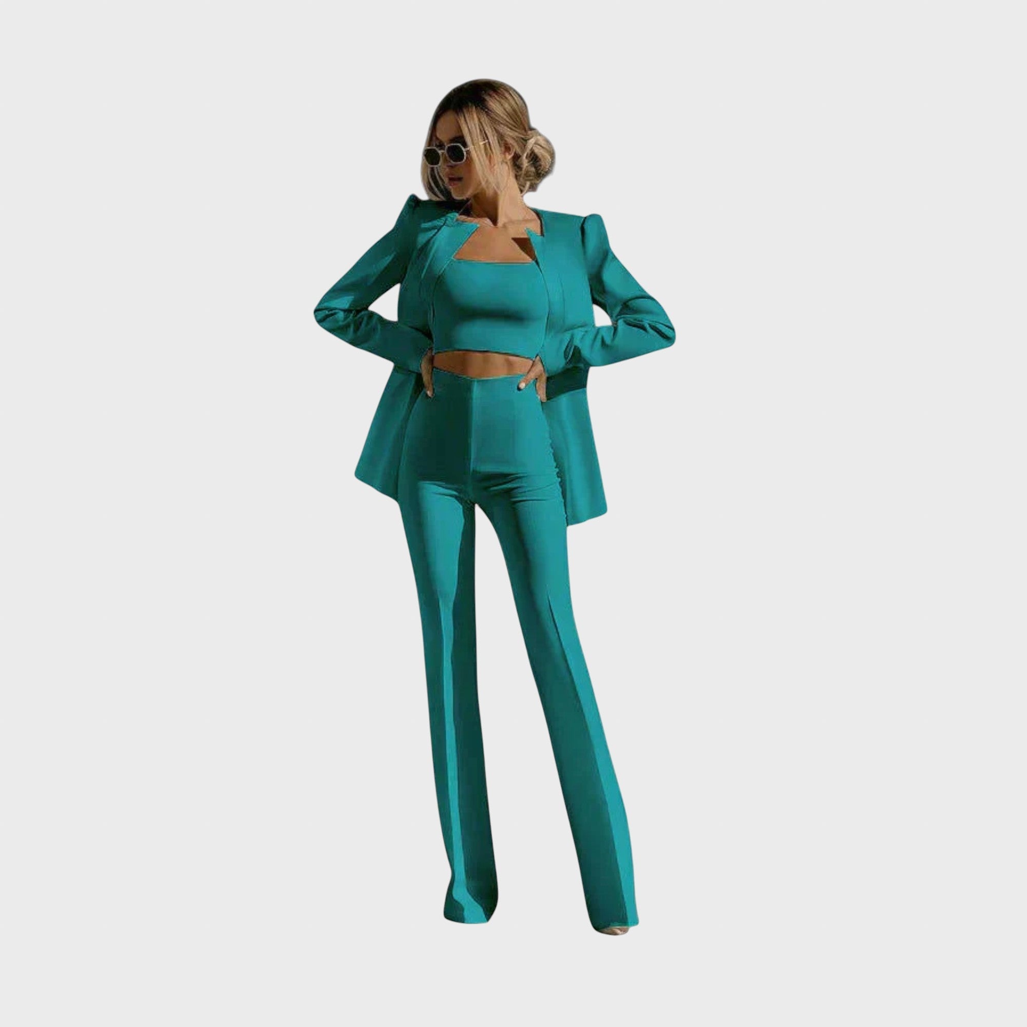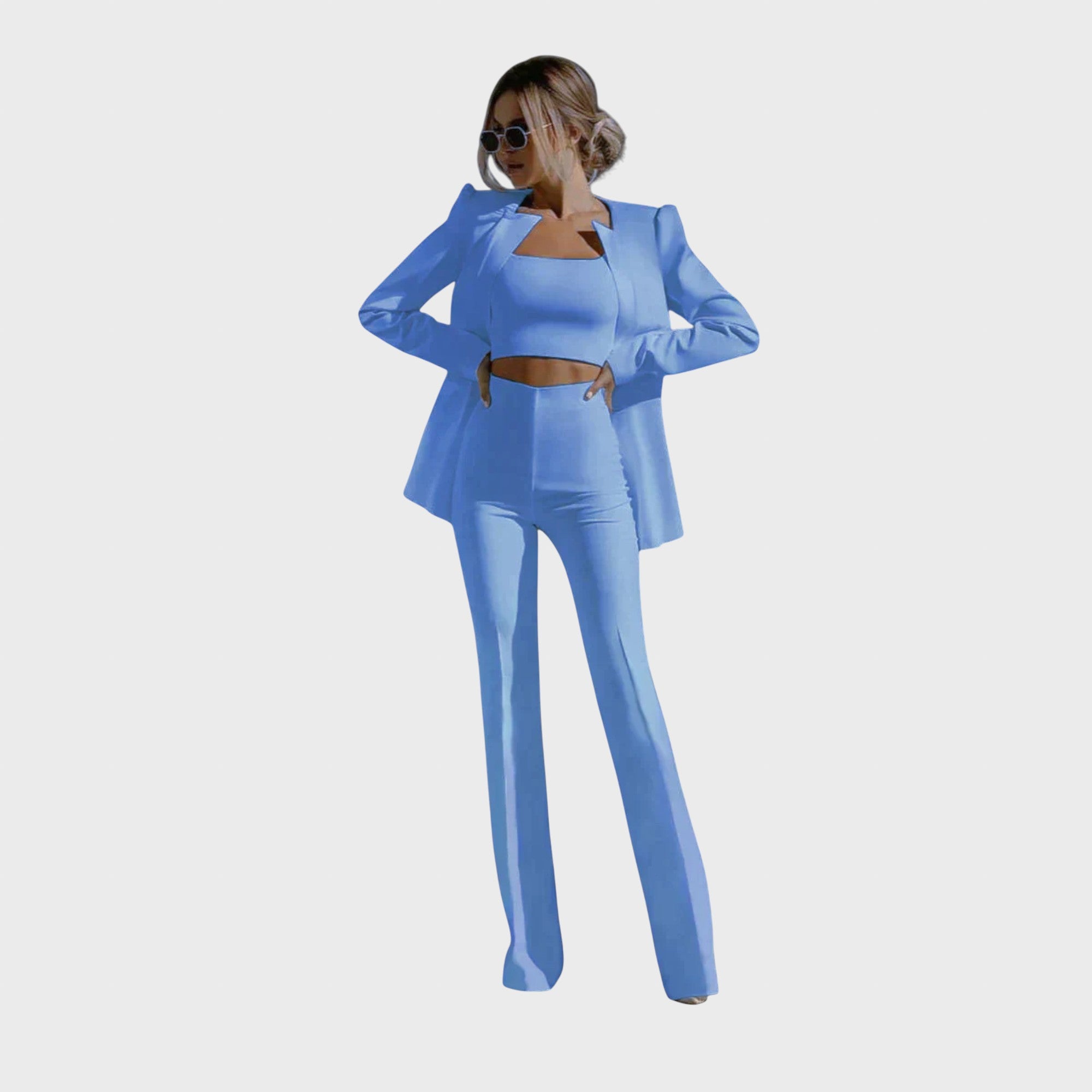 Ez a stílusos, háromrészes szett egy modern blézert, egy elegáns felsőt és egy kényelmes nadrágot tartalmaz, így ideális a mindennapi élet stílusos lebonyolításához. Akár az irodába, akár egy laza vacsorára szánod, ez a szett a maximális kényelmet ötvözi az egyedi stílussal!
